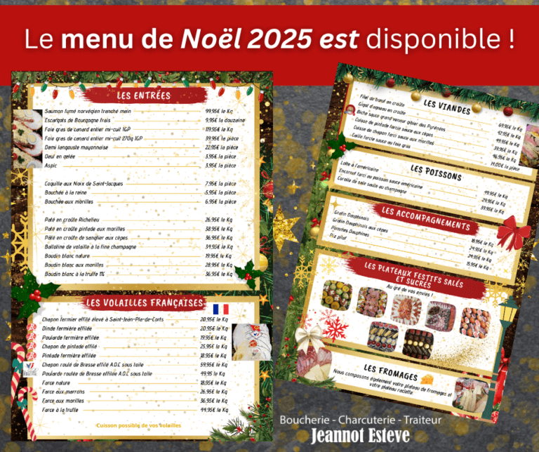 La Boucherie Charcuterie Jeannot Esteve d’Argeles-sur-Mer vous a concocté un menu complet de fête avec entrée, plat (viande ou poisson) et fromages. Tout est à la carte donc vous préparez le menu que vous souhaitez !